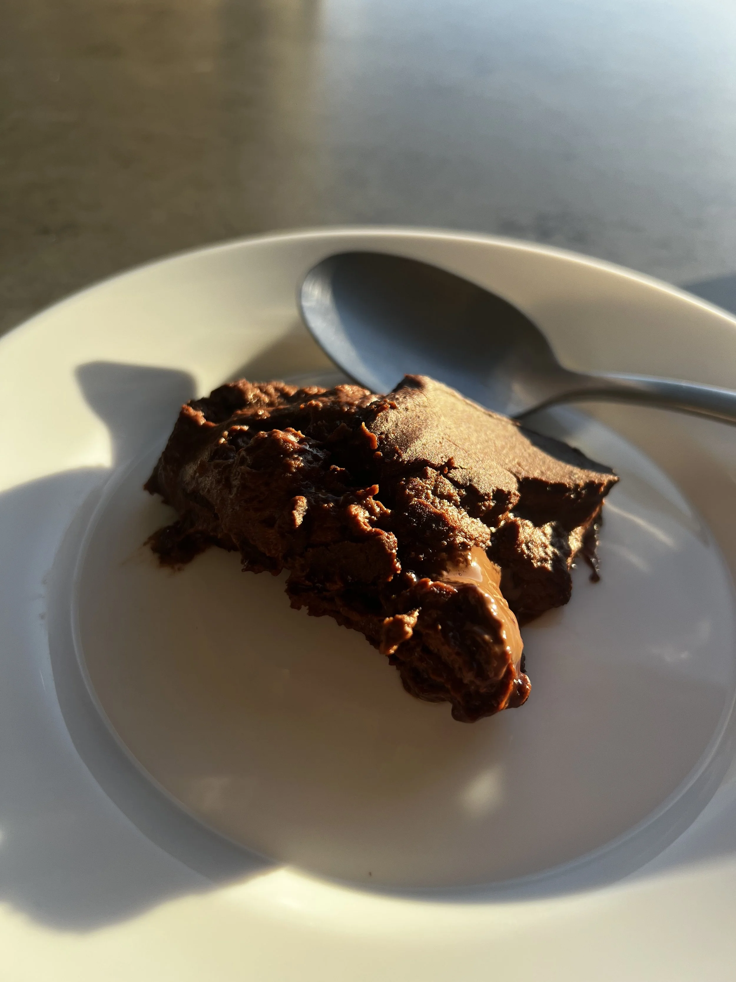Bake for 15-18 minutes until gooey inside but set on top (the top will be quite jiggly). If unsure, remove from the oven and just take a small taste from an edge - it should be gooey like a self-saucing pudding but with a slight mousse like texture on top. The less time in the oven, the more velvety and ‘saucy’ it’ll be, the longer you cook, the more mousse like it’ll become. Be aware, by 25-30 mins it starts to bake through and will become closer to a soufflé (though won’t be exactly the same of course).