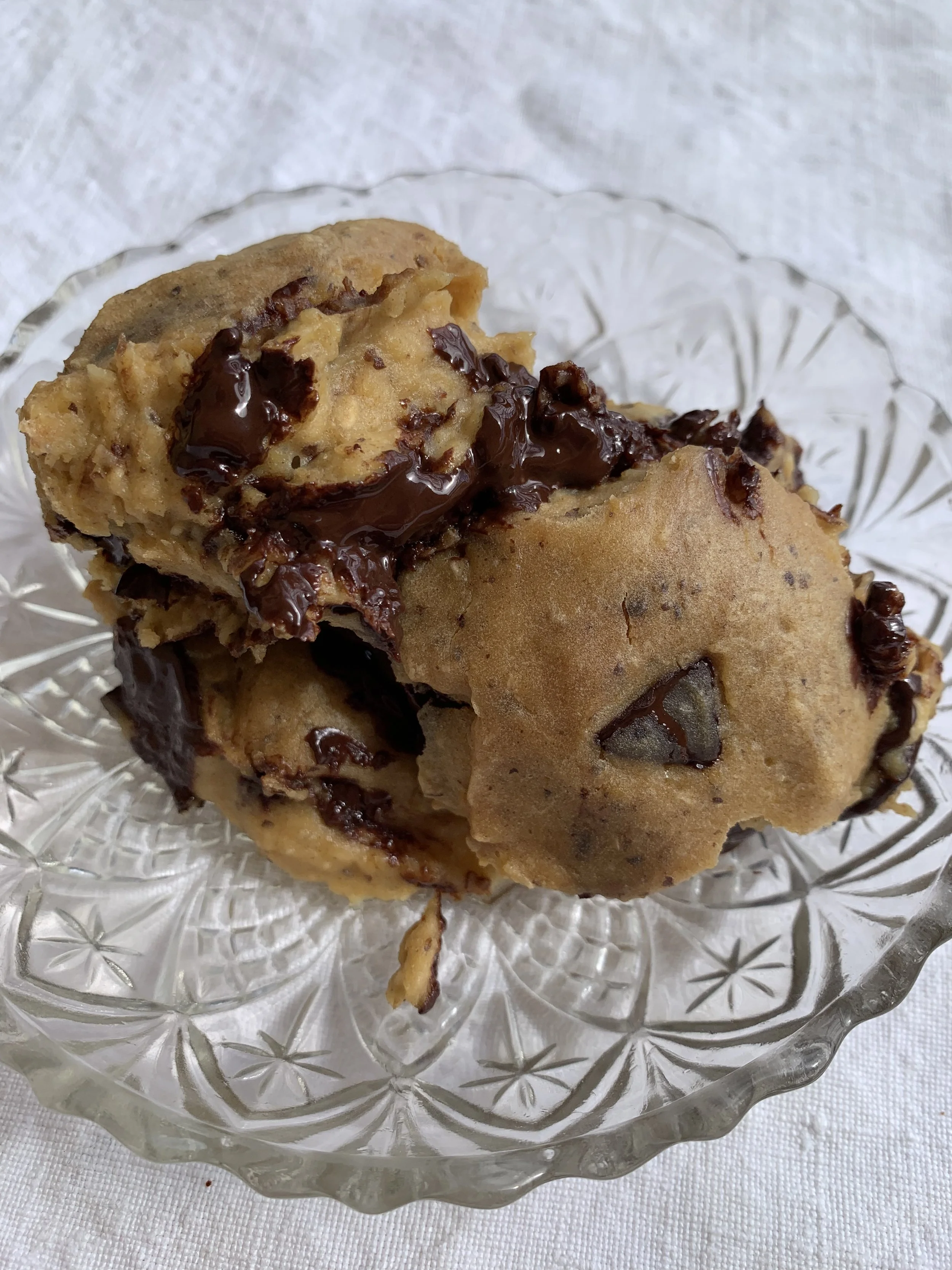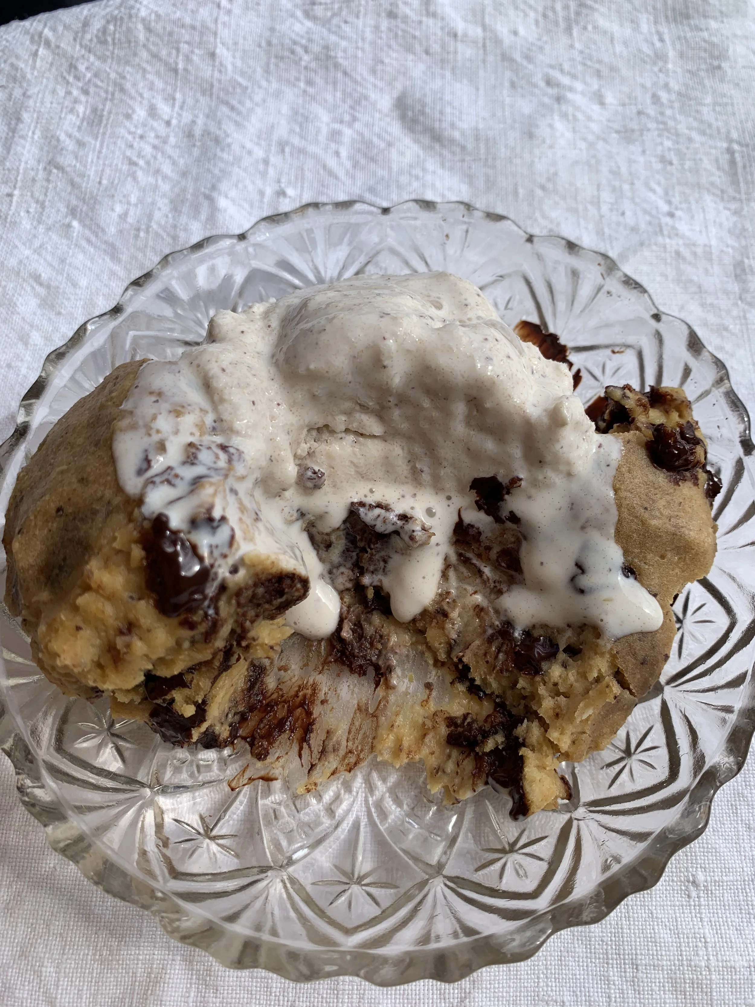 I thought I’d have to do some more tweaking, but it creates the almost bread-like outer shell you see in all the viral videos, but underneath is this molten cookie lava, which pairs beautifully with a scoop of my vanilla ice cream or a thick dollop of Greek yoghurt (or whatever yoghurt you tolerate).